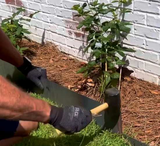 Start by laying out the general outline of the bed you want to protect. A string trimmer can make easy work of this and let's you see what the shape of the bed is going to look like. Roots and large rocks may have to be removed prior to installing the sections.